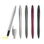 Descripción Lapicero plástico de sistema giratorio, de color plateado mate, con goma antidezlizante en negro. Resaltador en el extremo superior.